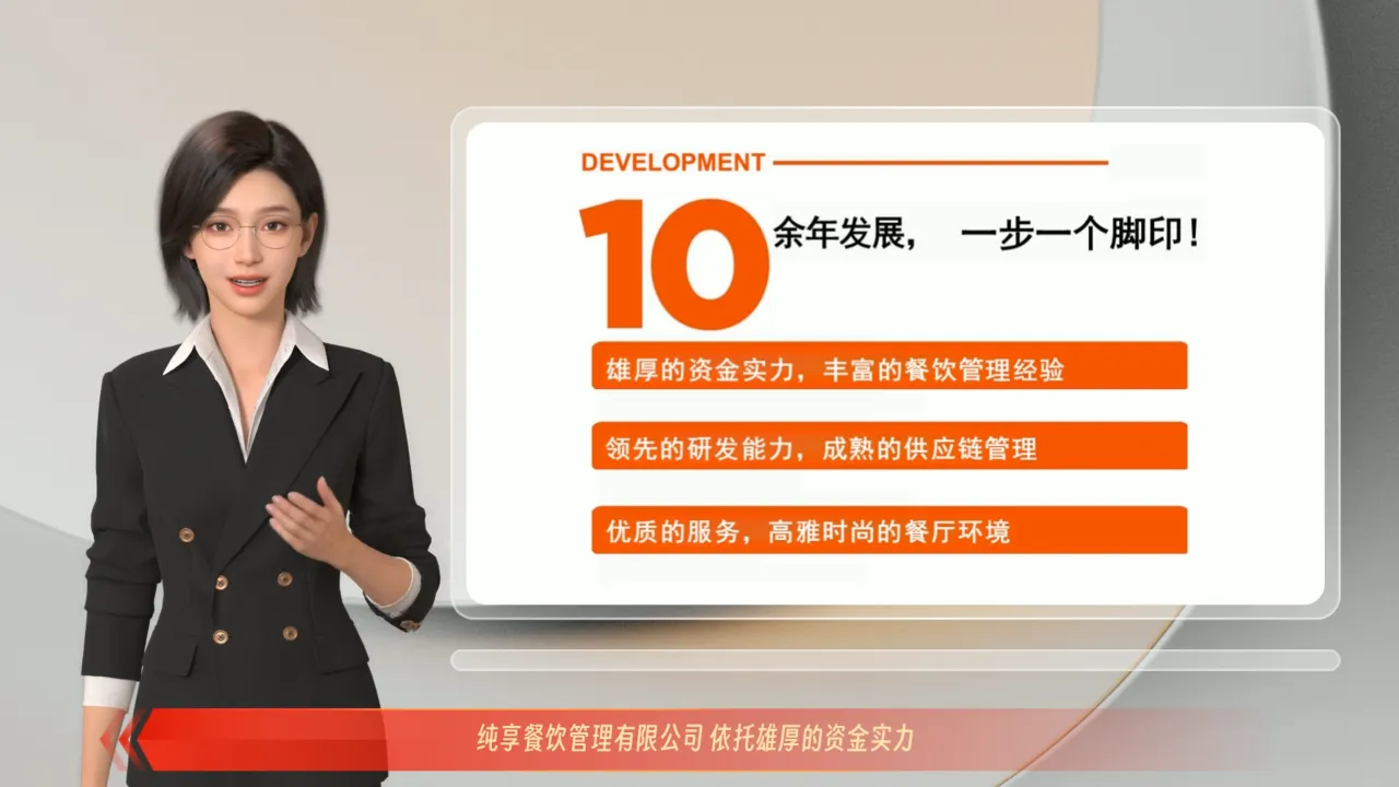 大家好,欢迎了解纯享餐饮管理有限公司简介,我是数字人琳娜。