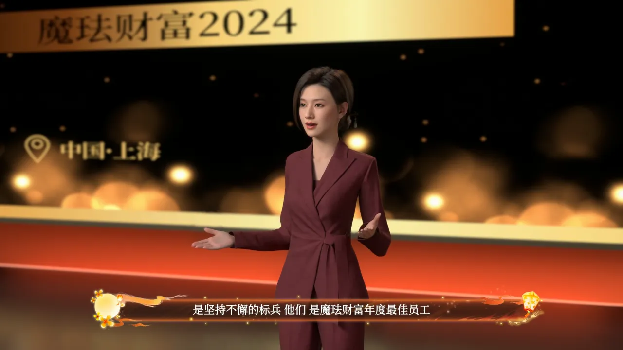 龙腾虎跃庆盛事,欢歌笑语迎新春。神州春暖山河秀,华夏龙腾日月新。尊敬的同事们, 大家晚上{好:hao3}!我是魔珐财富的数字主持人芸梅,非常高兴与各位共同参加我们年终财富盛典暨龙年新春晚会。2023年,我们一起度过了一年的努力和奋斗,尽管市场环境不断变化,我们却坚持着使命和价值观,取得了令人瞩目的成绩。希望在本次年会上,我们互相激励,共同欢庆,执笔书写下一个更加辉煌的未来!接下来,有请我们的集团总经理致辞,掌声有请!