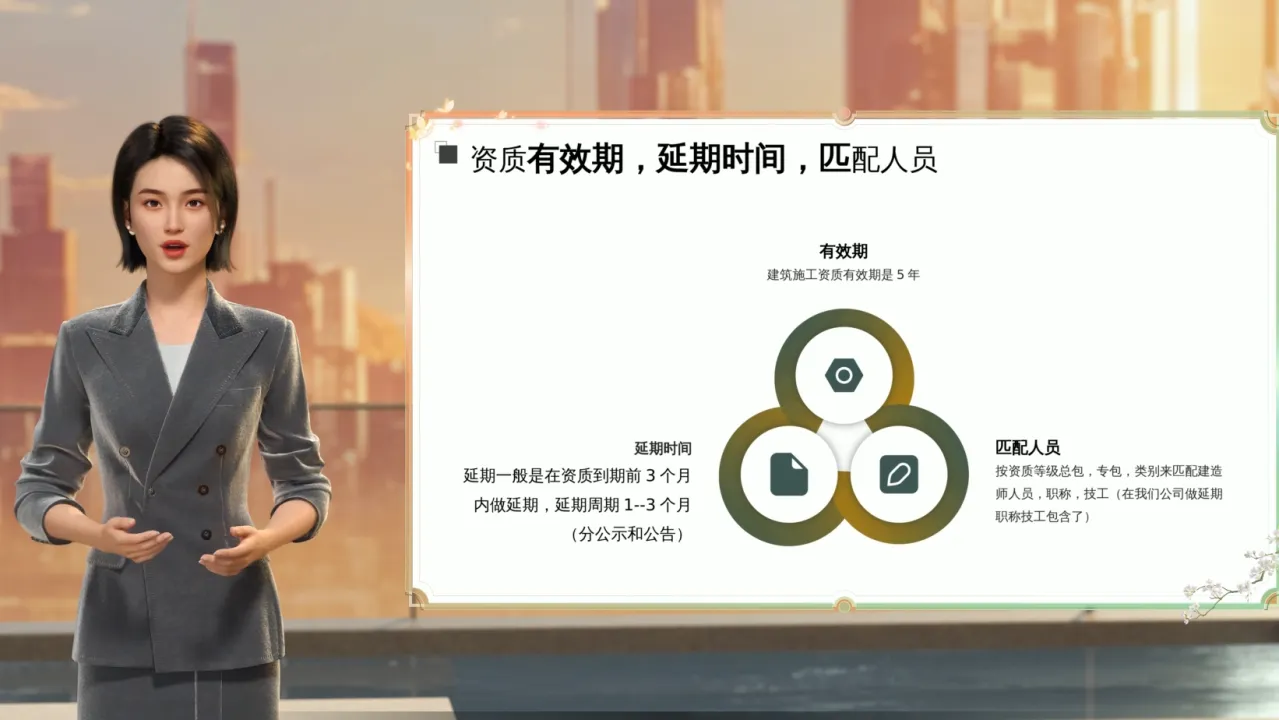 先说说建筑业企业资质延期。建筑施工资质的有效期是 5 年。在做资质延期的时候,需要按照资质等级、总包、专包以及类别来匹配相应的人员,像建造师、职称人员、技工等。在我们公司办理延期的话,职称和技工相关事宜都包含在内。延期一般要在资质到期前 3 个月内进行,整个延期周期是 1 到 3 个月,这个过程分为公示和公告两个阶段