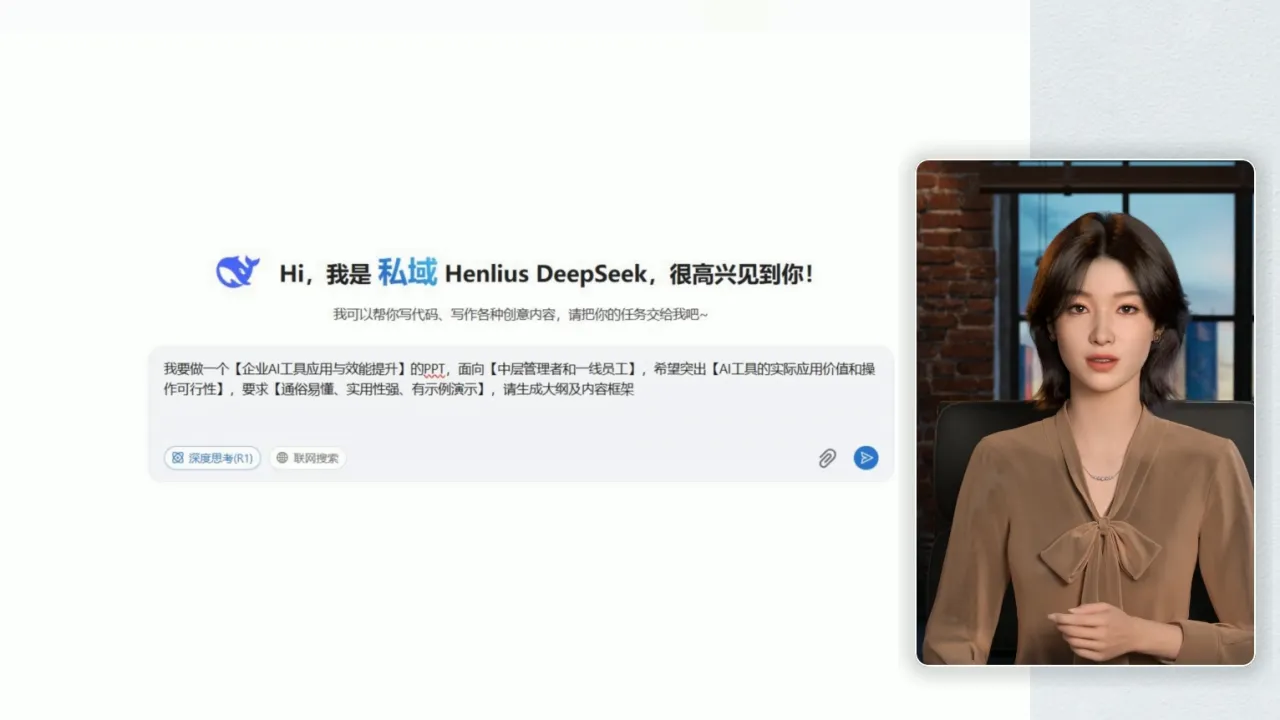 在对话栏,输入你想要的目标内容。比如【企业AI工具应用与效能提升】的PPT,面向【中层管理者和一线员工】,希望突出【AI工具的实际应用价值和操作可行性】,要求【通俗易懂、实用性强、有示例演示】,请生成大纲及内容框架,以Markdown格式输出。