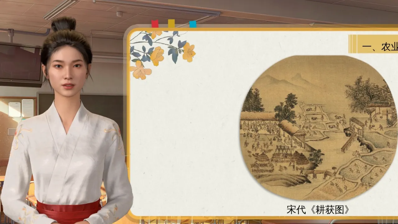 今天让我们从《耕获图》中窥见农业的发展。《耕获图》描述了宋代农民从耕作到收获的情景,展现了农业生产的繁忙景象。请同学们仔细观察画面右下角的动态,