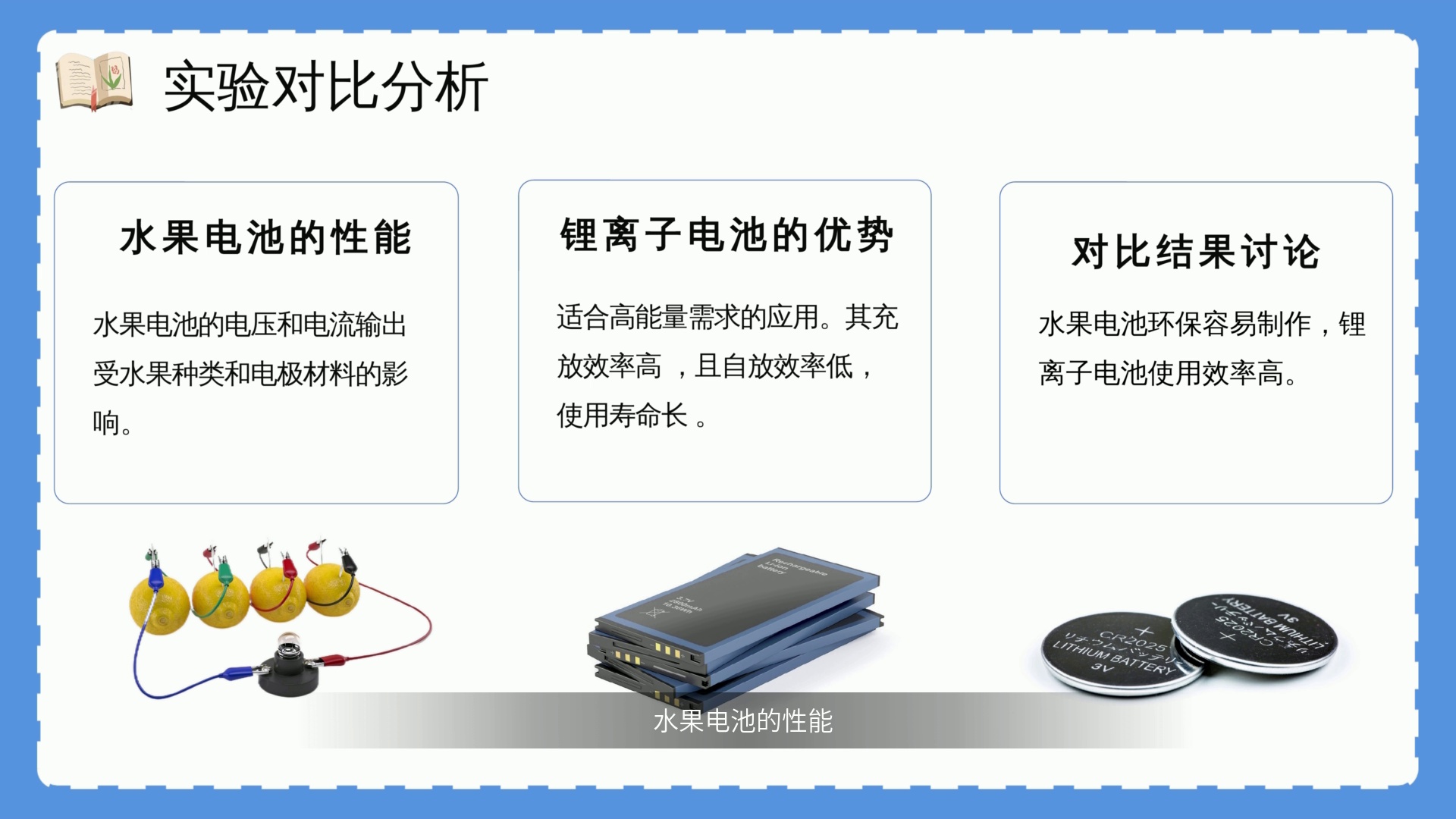 水果电池的性能, 水果电池的电压和电流输出受水果种类和电极材料影响显著。 不同水果的酸度和糖分含量直接决定了其电化学性能。 锂离子电池的优势, 锂离子电池在能量密度和循环寿命方面表现优异, 适合高能量需求的应用。 其充放电效率高, 且自放电率低, 使用寿命长。 对比结果讨论 ,水果电池虽然环保且易于制作, 但能量输出远低于锂离子电池。 锂离子电池在实际应用中更具优势, 适合现代电子设备。