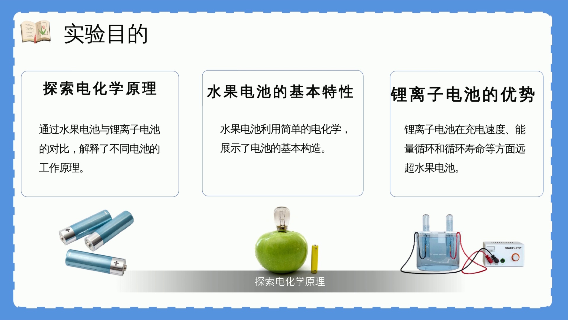 大家好!今天我们要从一个简单的实验开始——用柠檬点亮LED灯。看似不起眼的水果电池,其实蕴含着电化学的基本原理。而当我们把目光转向现代科技,锂离子电池已经成为驱动手机、电动车的核心力量。从酸酸的柠檬到精密的电池技术,电化学的故事就在我们身边,今天就让我们一起揭开它的神秘面纱! 本节课分为五个部分 实验背景、实验目的、实验过程 结果讨论、未来展望