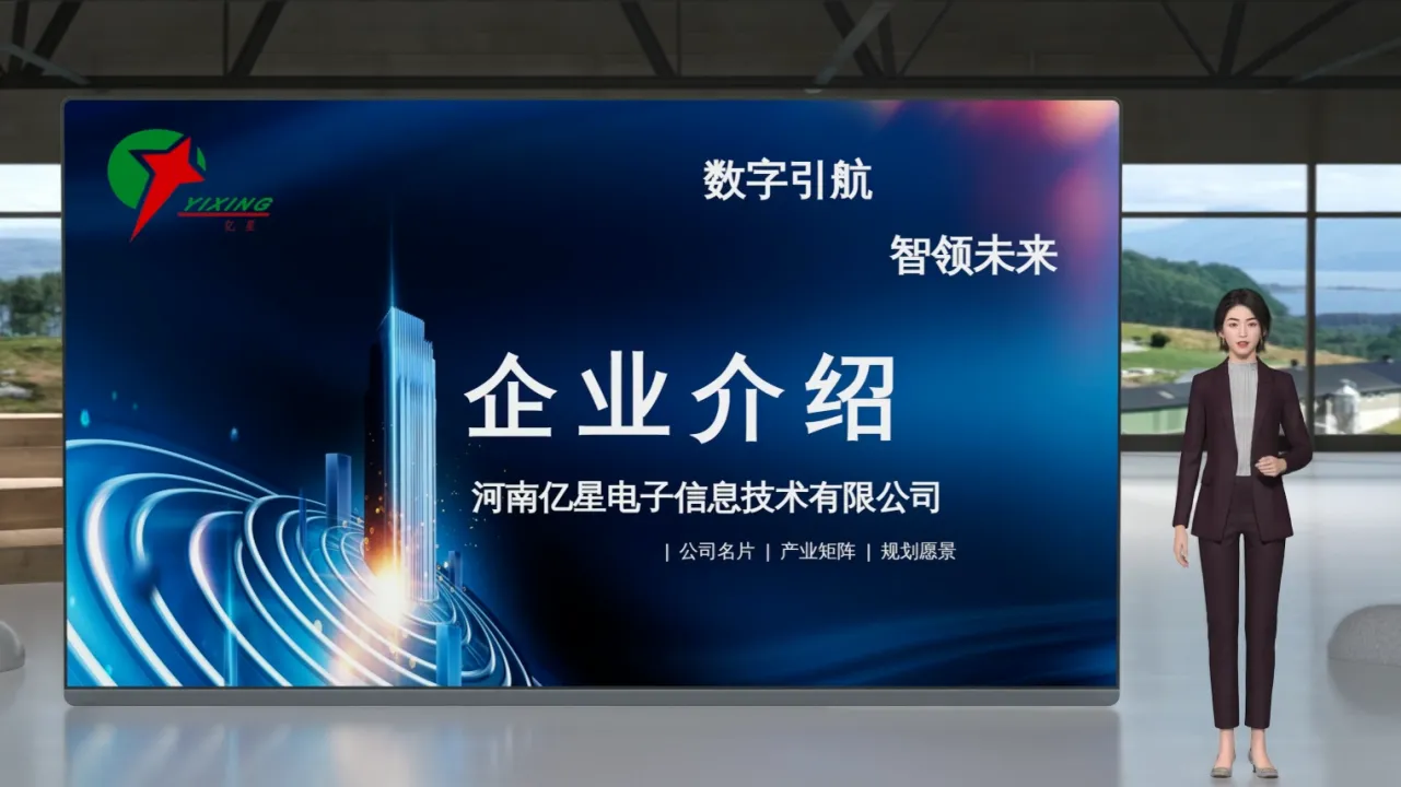 尊敬的各位来宾,大家好!我是数字人“小亿”,今天非常荣幸为大家介绍河南亿星电子信息技术有限公司——一家以科技创新为驱动,专注于企业数字化转型和智慧化应用的高新技术企业。让我们共同开启这段“数字引航、智领未来”的旅程。