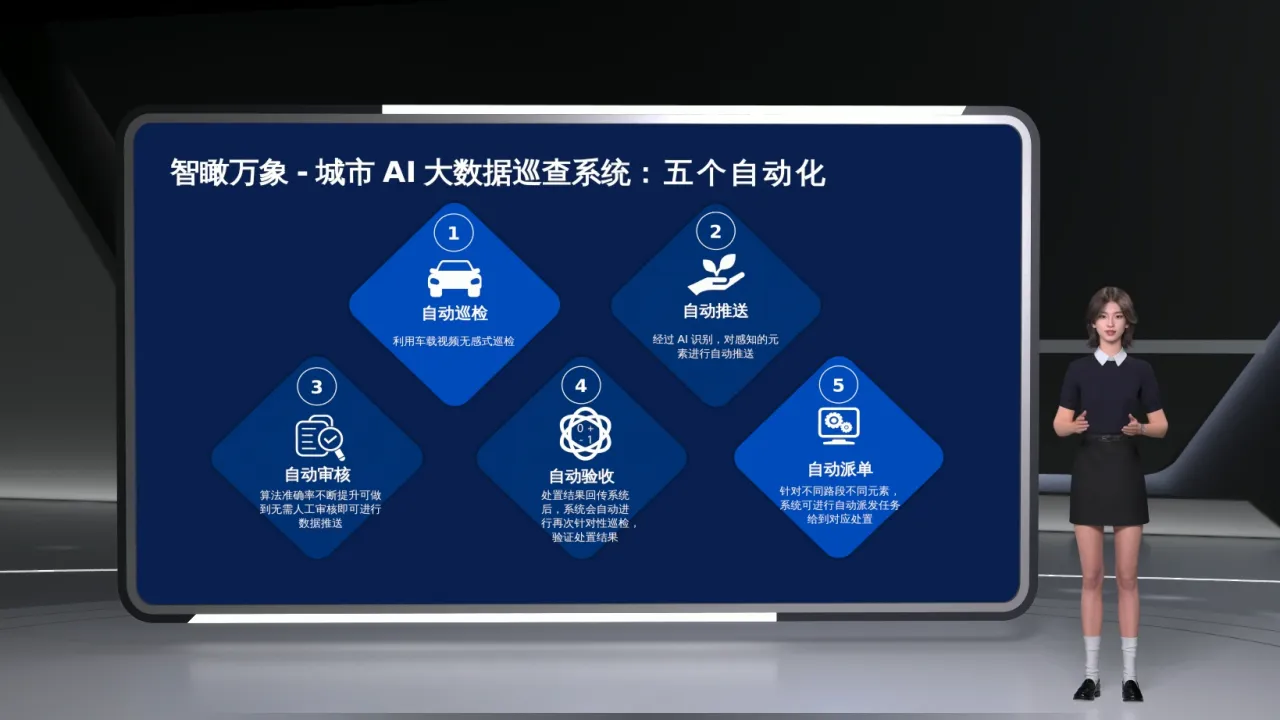 通过上述流程和技术打造的应用场景,最终在城市治理层面体现为“五个自动化”:自动巡检、自动推送、自动审核、自动验收、自动派单,有效提升了城市运行效率。