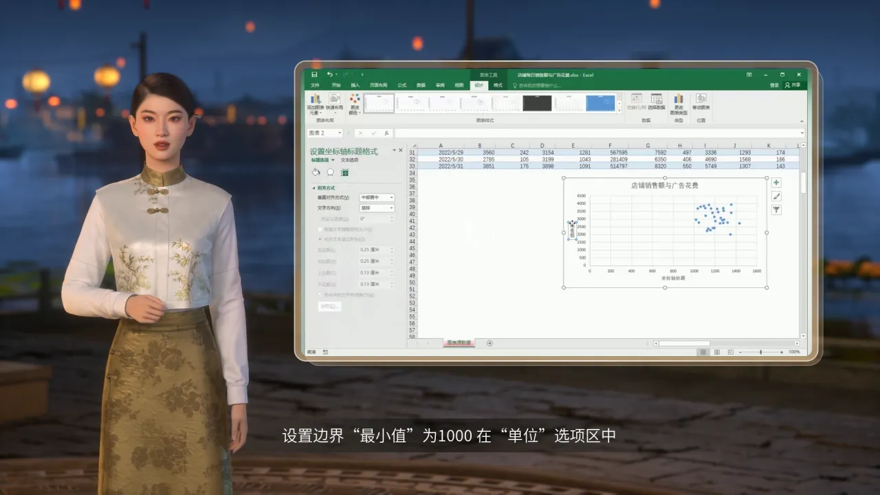 如何使用散点图展示店铺销售额与广告花费的关系,具体操作步骤如下: 打开“素材文件 选择一个空白单元格,选择“插入”选项卡,在“图表”组中单击“插入散点图或气泡图”下拉按钮,在弹出的下拉列表中选择“散点图”类型插入一个空白散点图。用鼠标右键单击图表,在弹出的快捷菜单中选择“选择数据”命令,弹出数据源”对话框,单击“添加”按钮,弹出“编辑数据系列”对话框,编辑数据系列系列名称: 选择区域:X轴系列值和Y 轴系列值。编辑图表布局,为图表添加图表标题和坐标轴标题。在图表中双击横坐标轴,打开“设置坐标轴格式”窗格,选择“坐标轴选项”选项卡,设置边界“最小值”为1000,在“单位”选项区中设置“主要”为50,在图表中选中纵坐标轴,在“设置坐标轴格式”窗格中选择“坐标轴选项”选项卡面,设置边界“最小值”为1500。在图表中选中数据系列,在“设置数据系列格式”窗格中选择“填充与线条”选项卡,单击“标记”按钮,在“填充”组中选中“无填充”单选按钮,在“数据标记选项”组中选中“内置”单选按钮,设置标记类型和大小。便能生成表示店铺销售额与广告花费的关系的散点图了。