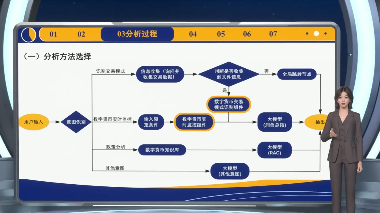 这是我们智能体工作搭建的整体思维图。意图识别交易模式首先信息收集节点,判断是否收到文件信息,如果收到则进入自主创建的数字货币交易模式识别组件,输出交易模式识别结果。最后经过大模型进行润色总结。 数字货币实时监控意图,通过用户输入查询信息,经过数字货币实施监控组件,对数字货币交易进行实时监督,最后由大模型润色总结。 政策分析意图通过结合数字货币知识库和大模型的检索能力,来帮助我们进行政策分析,提出建议。 在提问的问题涉及数字货币且不在三个意图以外,我们会通过一个大模型和相关插件来帮助解决数字货币交易。