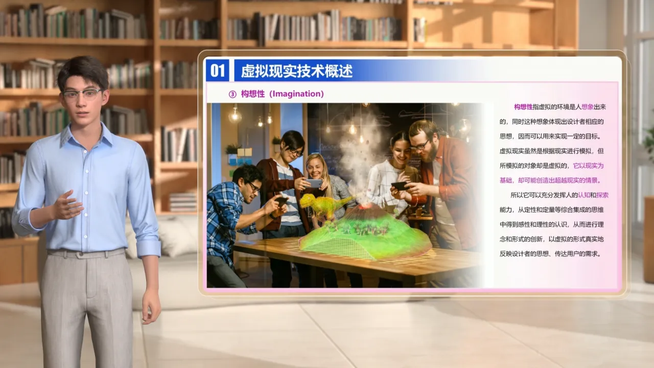虚拟现实的3I特征是本节课的重点之一,它主要关注三个关键方面:一是虚拟环境的准确呈现,即沉浸感;二是人机交互的自然性,即交互性,三是感知信息合成的可能性,即构想性。虚拟现实依靠动态环境建模、立体显示、传感器、系统开发工具、实时三维图形生成和系统集成等核心技术,让用户仿佛身临其境般感受虚拟环境,进而实现探索和体验虚拟世界的目标。