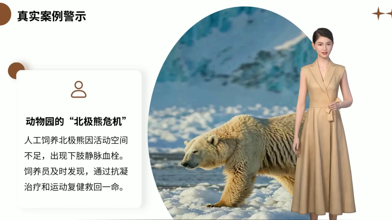 案例3:动物园的“北极熊危机” 人工饲养的北极熊因活动空间不足,出现下肢静脉血栓,幸亏饲养员发现及时,通过抗凝治疗和运动复健救回一命。