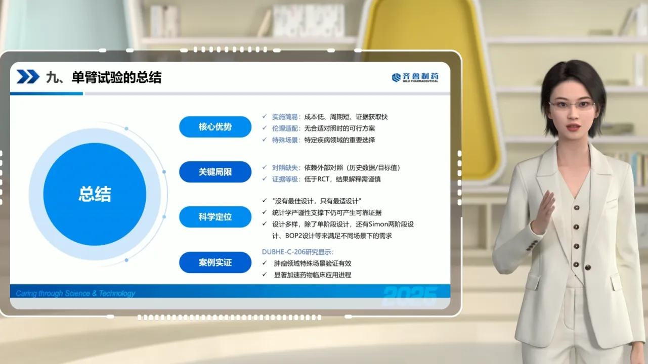 接下来我们给单臂试验做一个简单的总结,单臂试验作为一种仅设单一治疗组的临床试验设计,其优势主要体现在以下几个方面:它在实施过程中相对简单易行,成本较低且周期较短,能够快速获取有效证据;其次,对于某些基于伦理考量不宜设置空白对照或缺乏合适匹配对照的临床试验,单臂试验是一种可行的选择。 然而,单臂试验也存在局限性。由于缺乏平行对照,它只能与外部对照进行比较。这种比较方式使得研究间差异的影响难以区分,从而增加了对研究结果进行准确评价的难度。 尽管单臂试验在证据等级上不及随机对照试验,但在某些特定疾病领域,它仍然具有重要的临床价值。 必须指出,在临床试验领域,不存在绝对的最佳试验设计,只有最适宜特定研究目标和情境的设计。单臂试验在符合特定适用条件时,是一种科学、合理且可行的选择。在统计学严谨性作为坚实支撑的前提下,单臂试验同样具备提供可靠且有力临床证据的能力。同时单臂试验的设计也很多样,除了单阶段设计,还有Simon两阶段设计、BOP2设计等来满足不同场景下的需求。 通过DUBHE-C-206研究的案例,我们清晰地看到:在满足特定条件时,单臂试验不仅能高效验证药物价值,还可加速其临床应用。这一设计在肿瘤领域的前景,