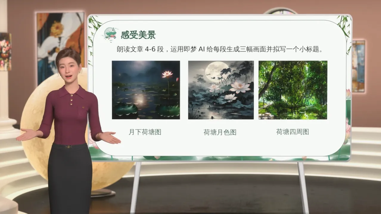 今天,我们就聚焦文中4-6段,在文字构建的光影世界里,感受那份独属于夏夜的静谧与灵动,更要解锁朱自清先生“以文作画”的写作密码。 请大家先跟着老师一起朗读4-6段,在朗读的过程中,试着在脑海里勾勒出画面。我们可以给这三段分别拟上小标题。第4段聚焦荷塘本身,我们可以叫它“月下荷塘图”。这里有荷叶的舒展、荷花的娇羞、荷香的缥缈;第5段转向月光与荷塘的交融,不妨称它“荷塘月色图”。月光如何洒在叶上、花上,又如何穿过树影落在地上,都藏在字里;第6段则将镜头拉远,呈现“荷塘四周图”。树影、灯光、蝉鸣与蛙声,共同织就荷塘之外的朦胧夜色。大家也可以试试用AI工具给每段生成几幅画面,看看AI捕捉到的光影与你想象中的是否一致。或许你会发现,文字能唤起的想象,远比图片更丰富——这正是散文的魅力。