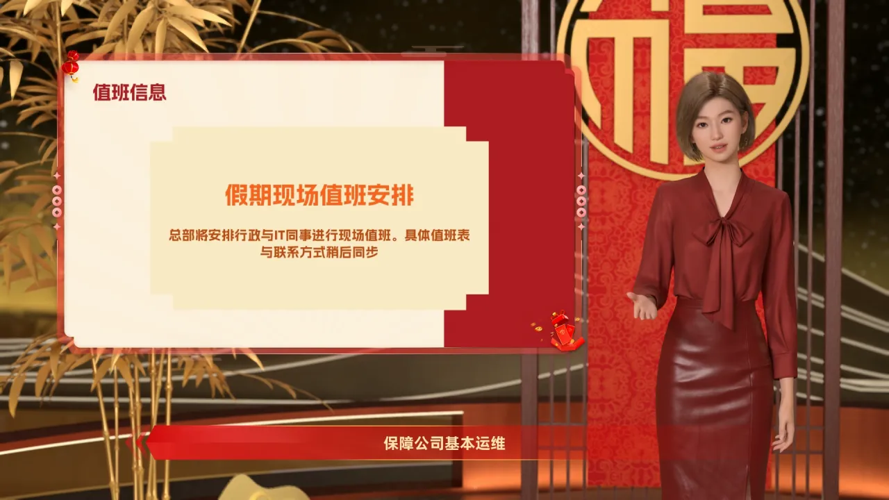 第三是值班信息。 春节期间,总部会安排行政与IT同事值班,保障公司基本运维。具体的值班表与紧急联系方式,稍后会由各部门负责人点对点同步,请大家留意。