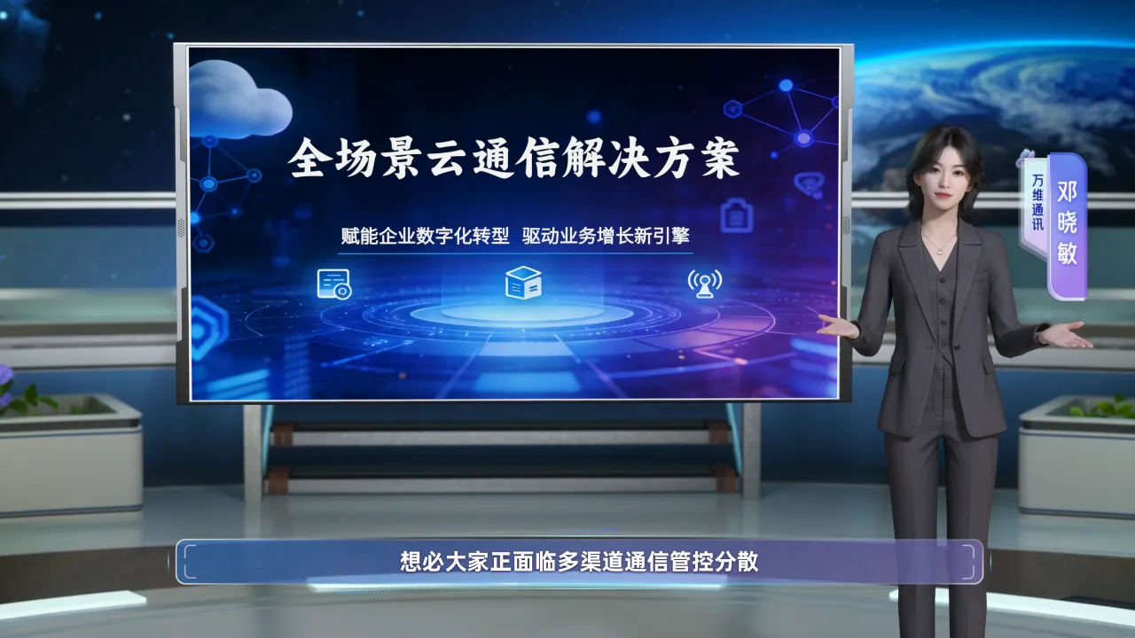各位企业同仁,大家好!我是万维通讯的业务经理邓晓敏。在企业数字化转型深化进程中,想必大家正面临{多渠道通信:duo1 qu2 dao4 tong1 xin4}管控分散、运营成本高、合规风控压力凸显等核心痛点。本次为大家推介的{全场景:quan2 chang3 jing3}{云通信:yun2 tong1 xin4}解决方案,正是为精准破解此类痛点打造。