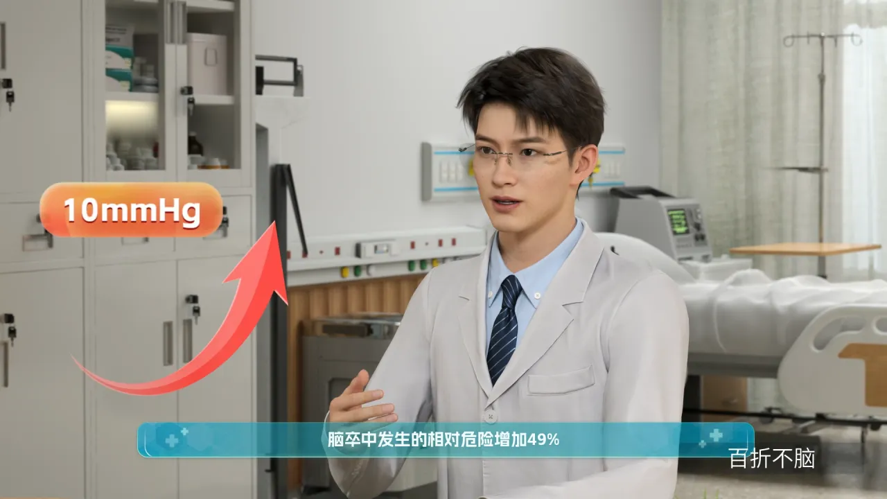 收缩压每升高10毫米汞柱,脑{卒中:cu4 zhong4}发生的相对危险增加49%;舒张压每升高5毫米汞柱,脑{卒中:cu4 zhong4}的危险增加46%。