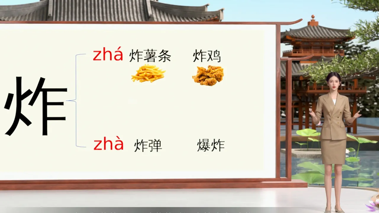 孩子们 {炸:zha2}的后面是食物的时候,它就读成2声{炸:zha2}。他还有另外一个音{炸:zha4},当物体突然裂开,就读四声,我们一起来读一读,炸薯条、、炸鸡 、、炸弹、、爆炸